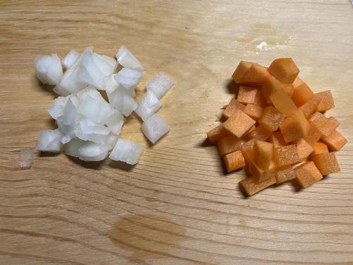 玉ねぎ、人参は5mm角の大きさに切る。