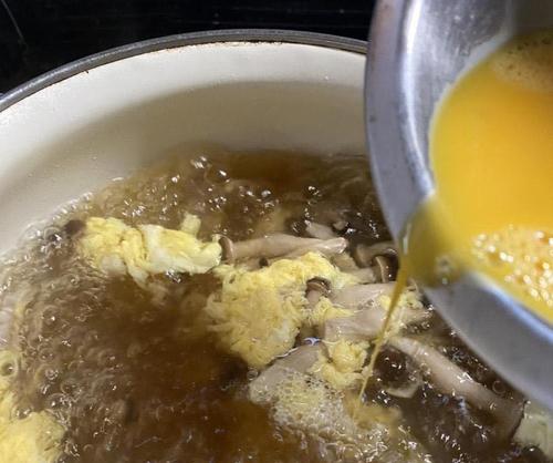 スープが沸いている状態で、予め溶いておいた卵を少しずつ流しこむ。