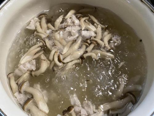 春雨が柔らかくなったら、しめじ、豚肉を加える。