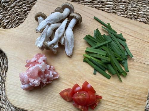 Step.4 ニラとミニトマトを加える。