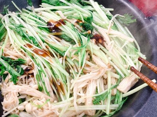 フライパンにごま油を熱し、にんにくとしょうがを入れる。えのきと水菜をしなるまで炒める。