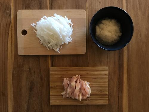 大根の皮をむき、2/3を細切りにする。残りの1/3は大根おろしにする。鶏肉は1㎝程度の細切りにする。