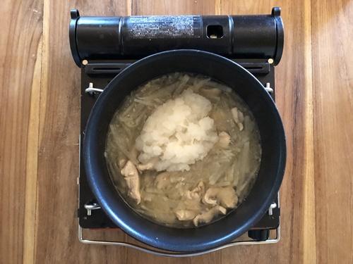 大根が柔らかくなるまで加熱したら大根おろしを加えて一煮立ちさせる。器に盛り、2~3cm幅に切ったせりをトッピングする。