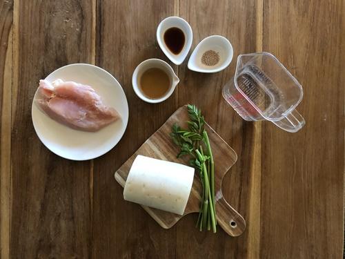 鍋にすべての調味料と水、細切りにした大根、鶏肉を入れて中火で加熱する。ふたをして、大根が透き通り柔らかくなるまで煮る。