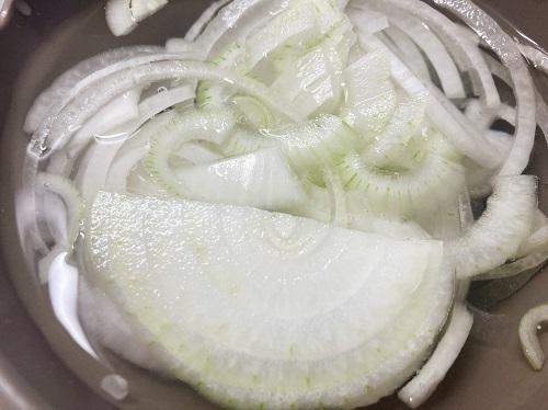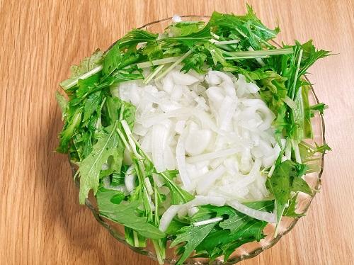 玉ねぎは繊維を断つように薄切りにする。塩(分量外)を振り、水につけておく。水菜は根元を切り落とし、2cm程度に切っていく。玉ねぎは器に盛る直前に少し揉み絞ると辛味が減る。