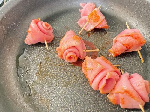 ベーコンはよく焼き目を付けながら焼いていく。お好みの焼き加減になったら火からおろしてつまようじを外す。(焼きが甘いと跡がつかないので、最低限焦げ目がつくくらいは焼く)