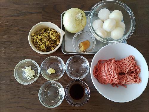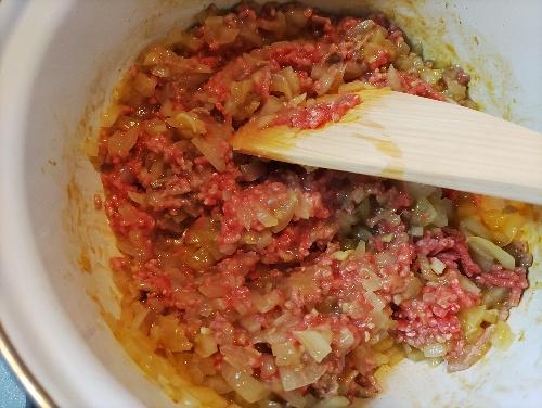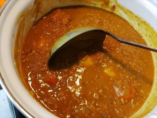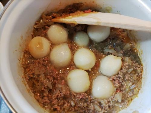ルウが溶けたら合いびき肉、みりん、酒を加えて炒める。焦げ付きやすいので様子を見ながら水を少量加える。