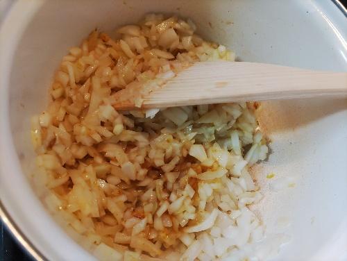 玉葱は上下を切り落とした後、みじん切りにする。人参も一口大に切っておく。鍋に米油、にんにく、しょうがを入れて弱火にかける。香りがたってきたら、玉葱と潰したバナナ(またははちみつ)を加えてしんなりするまで炒める。