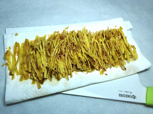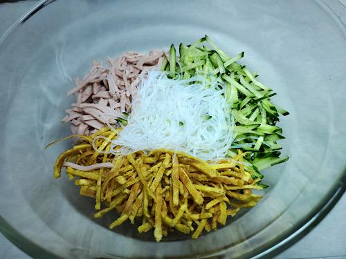 溶いた卵に塩を少々と片栗粉を入れてよく混ぜ、フライパンで薄く広げて両面しっかり焼く。ここでしっかり焼いておくことで、最後に水分を吸ってくれて全体がよくまとまる。粗熱が取れたら細切りにしておく。