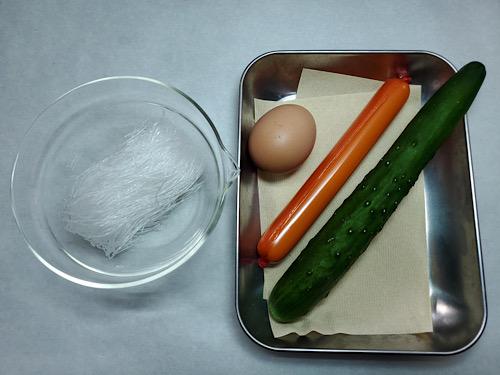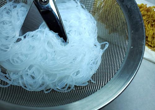 春雨に1カップの熱湯をそそぎ、10分ほど置いて戻しておく。粗熱が取れたらザルにあげ、包丁またはキッチンバサミで食べやすい長さに切っておく。
