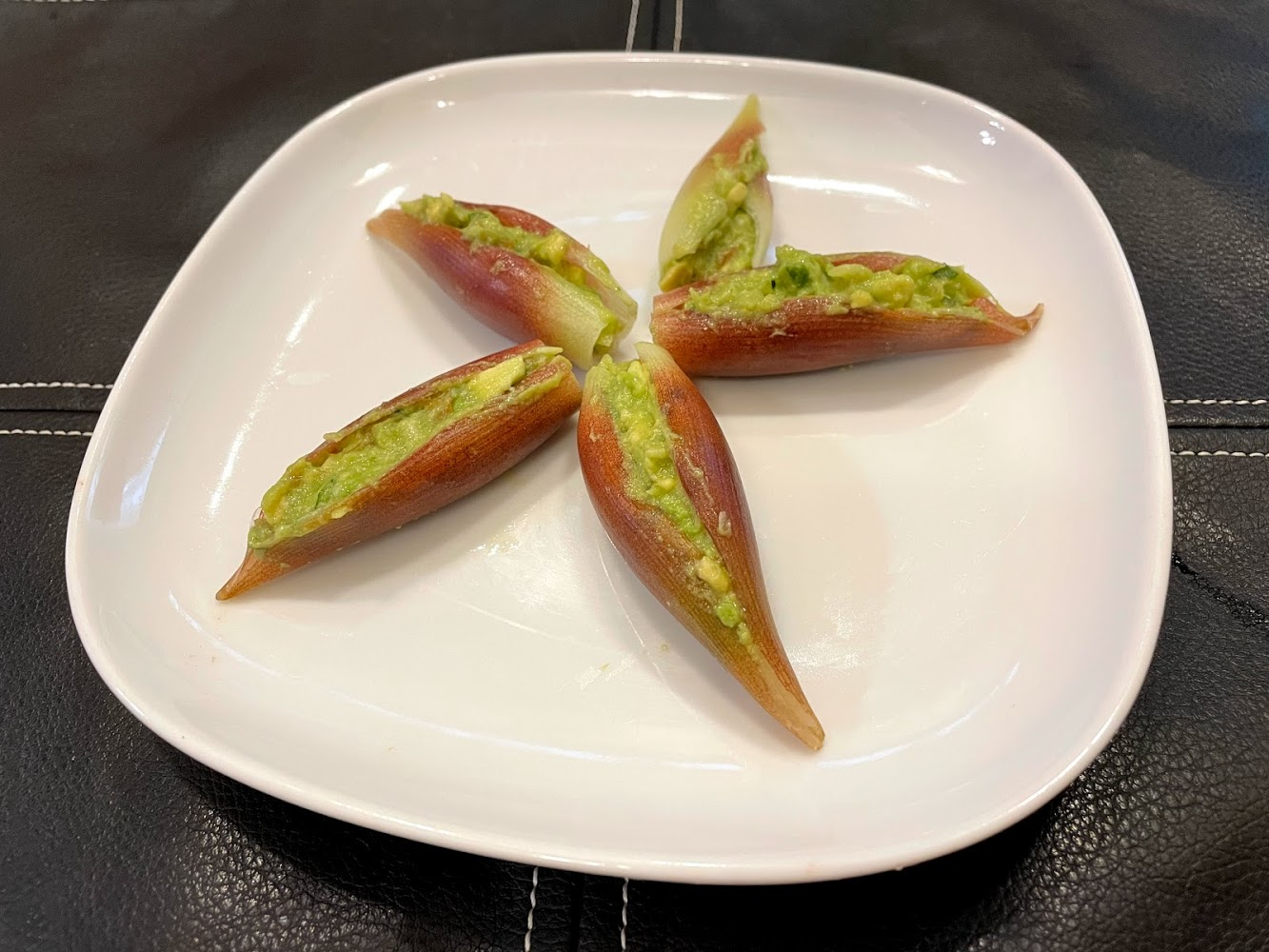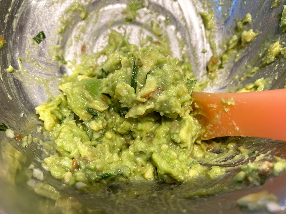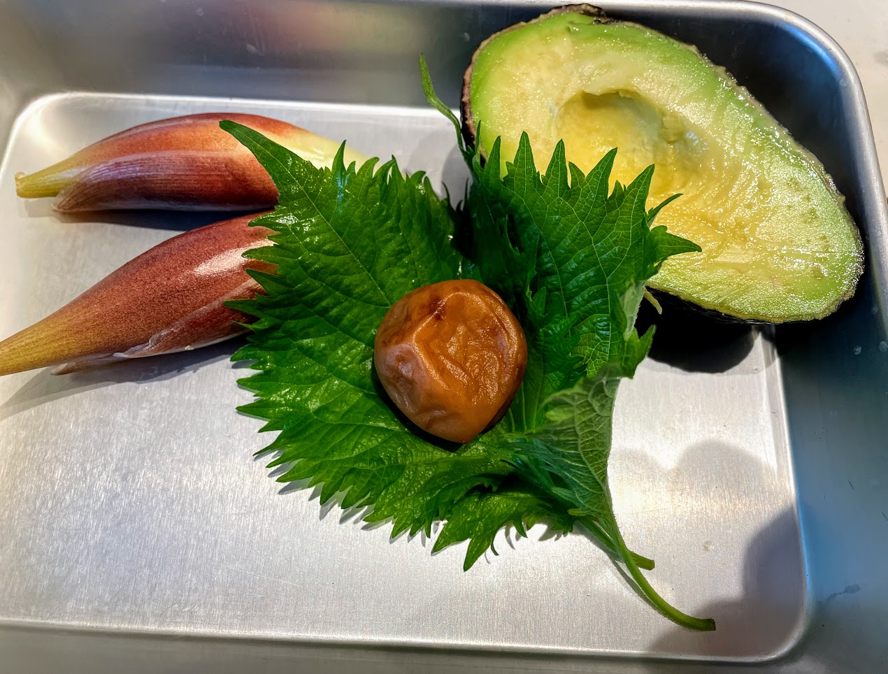 大葉、梅干しも名荷と同じサイズになるよう、細かく刻もう。アボカドは皮を剥き、ペースト状にすりつぶす。細かく刻んだ大葉、梅干し、みょうがをアボカドペーストと十分練り合わせてタネをつくる。アボカドは熟していないとペーストにするのが難しいので、十分に熟したものを使うようにしよう。