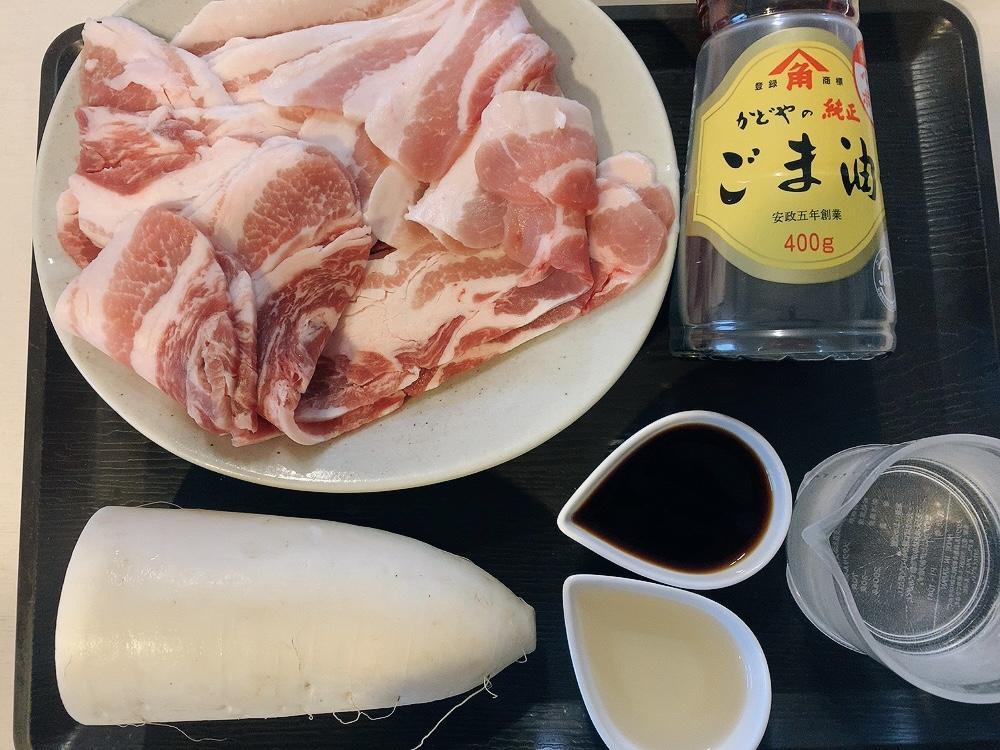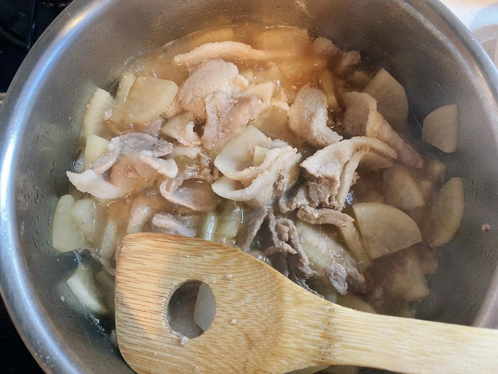 鍋にゴマ油をひいて、豚バラ肉と大根を炒める。