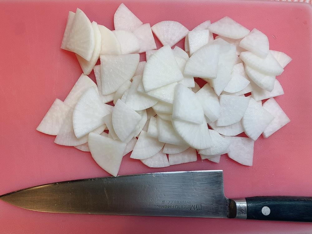 大根は皮を剥いてから、5mm幅程度のいちょう切りにする。いちょう切りとは、大根を縦に置いて十字に1/4サイズにカットしてから、切れ目を下にして置き、端から均等な厚さになるように切る切り方である。加熱時間を短縮するために、大根を耐熱皿に置いてラップをかけて、レンジで3分程度加熱しておく。