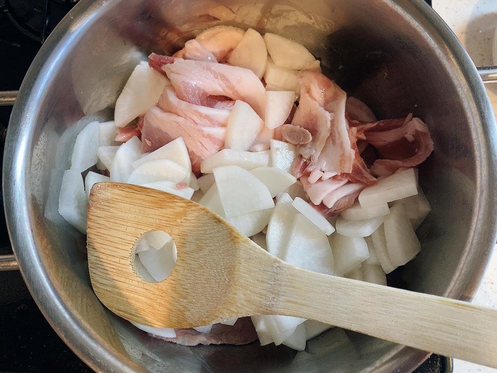 Step.2 鍋で豚バラ肉と大根を炒める