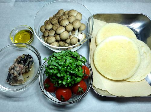 しめじが焼けたら魚のほぐし身と合わせ、オリーブオイルでなじませて味をととのえる。レシピではさば缶の水煮を使っているが、鮭ほぐし身などでもできる。ただし、塩加減が違うので、必ず味見をして最後の仕上げをしよう。イングリッシュマフィンに盛り付け、切ったプチトマトとスプラウトをのせたらできあがり。
