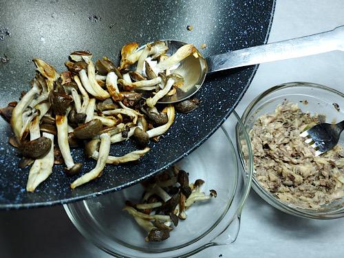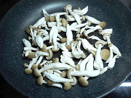 しめじは強めの弱火でじっくり水分を飛ばすのだが、焼いている間はさわらない。色がついてきてカサが減ってきたら一度ひっくり返す程度でよい。