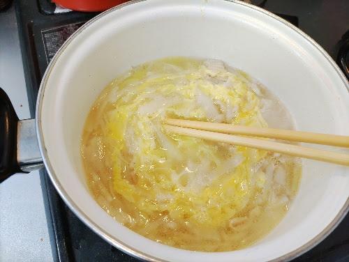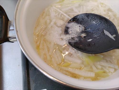 煮込んだらアクを丁寧にとり、顆粒中華出汁の素と塩を加えて再度10分ほど煮る。