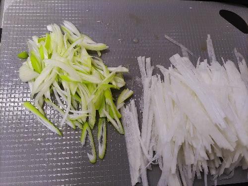 しょうがはよく洗って皮ごとすり下ろす。大根は皮を剥き細めの千切りに、長ねぎは縦半分に切って斜め細切りにする。鶏皮は食べやすい長さに揃え、細切りにしておく。