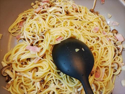 にんにくの香りが出てきたら、ベーコンを投入し脂が出てきたらしめじを加えて炒める。