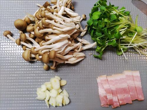 その間に具材をカットする。にんにくは皮を剥いてスライス、ベーコンは1cm幅の短冊切りに、しめじはいしづきを落とした後ほぐしておく。