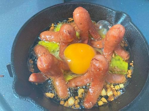 スキレットを火にかけ、ウインナーを加えて揚げ焼きしていく。ウインナーの足が広がってきたら、立てて円を描くように配置する。火を弱めてたまごを落とし、好きな半熟度になったら火からおろす。