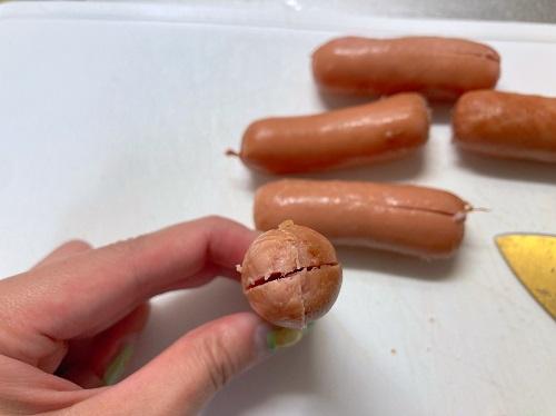 ウインナーの半分の位置まで縦に切れ目をいれる。足が4~8本になるようにする。