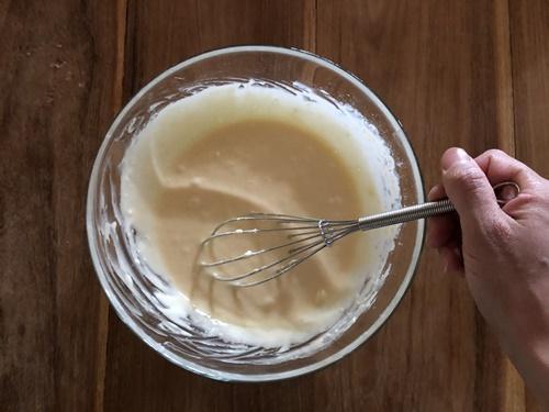 卵と牛乳を混ぜ合わせ、ホットケーキミックスを加えてダマにならないように泡だて器でよく混ぜ合わせる。