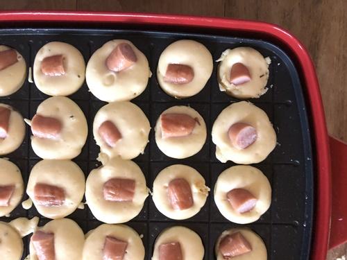 たこ焼き器に、キッチンペーパー等にしみ込ませてサラダ油をぬる。生地を流し入れ、ソーセージを入れて焼く。生地の周りが固まってきたら竹串などでクルクルまわしながら焼く。