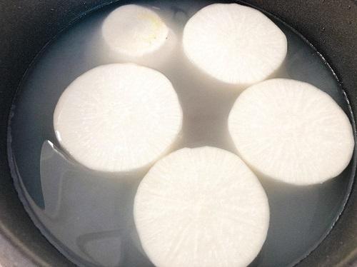 格子状に切り込みをいれた方を下にして、鍋にいれる。大根が被るように米のとぎ汁を加えて、水量が足りなければ水を足す。ふたをして中火で茹でる。約30分ほど茹で、竹串がスッと入る程度になったら皿にあげる。