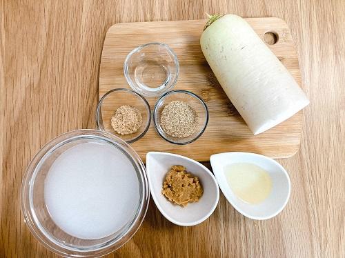 みそ、すりごま、みりん、砂糖、料理酒をすべて和え、ラップをしてレンジで1分加熱する。さらに混ぜてみその塊がないようにする。大根にかけ、好みで柑橘の皮を飾り完成。