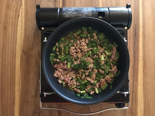 ニラは2㎝程度に切る。フライパンに豚ひき肉を入れて火にかける。豚ひき肉の色が変わってきたら、ニラ、みそ、醤油、酒、みりんを入れて汁の量が半量になる程度まで煮詰める。