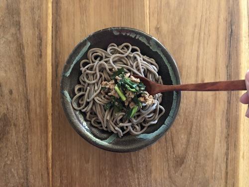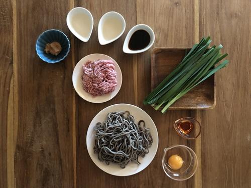 皿に水気を切ったそばを入れ、ニラそぼろをかける。卵黄を落とし、ラー油をかけていただく。