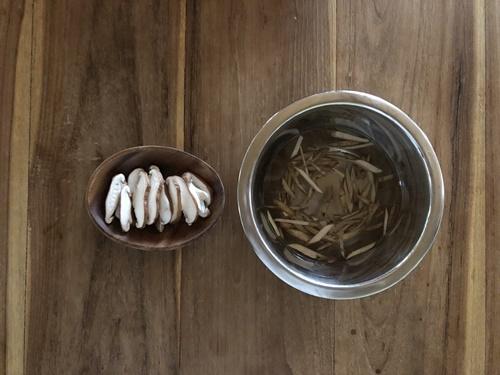 ごぼうはよく洗って皮をこそげ、細切りにする。しいたけは石づきを切り落とし、薄切りにする。