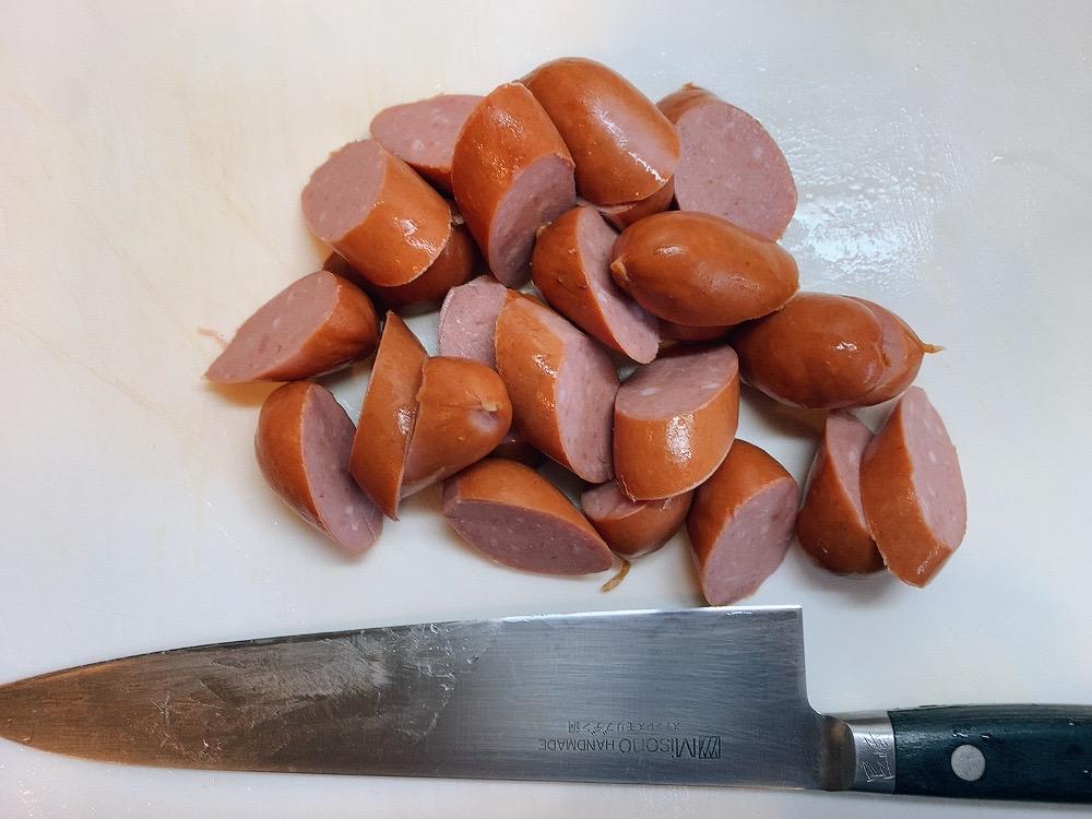 ウインナーを斜めに切り、3等分程度にカットしておくと、子どもも食べやすい大きさになるだろう。