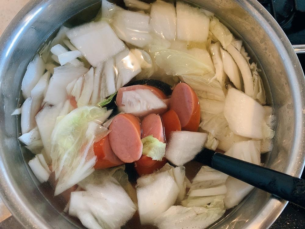 ウインナーと白菜を加えて煮ていく。白菜がクタクタになってきたら、完成となる。