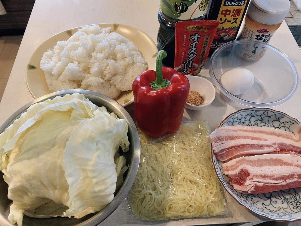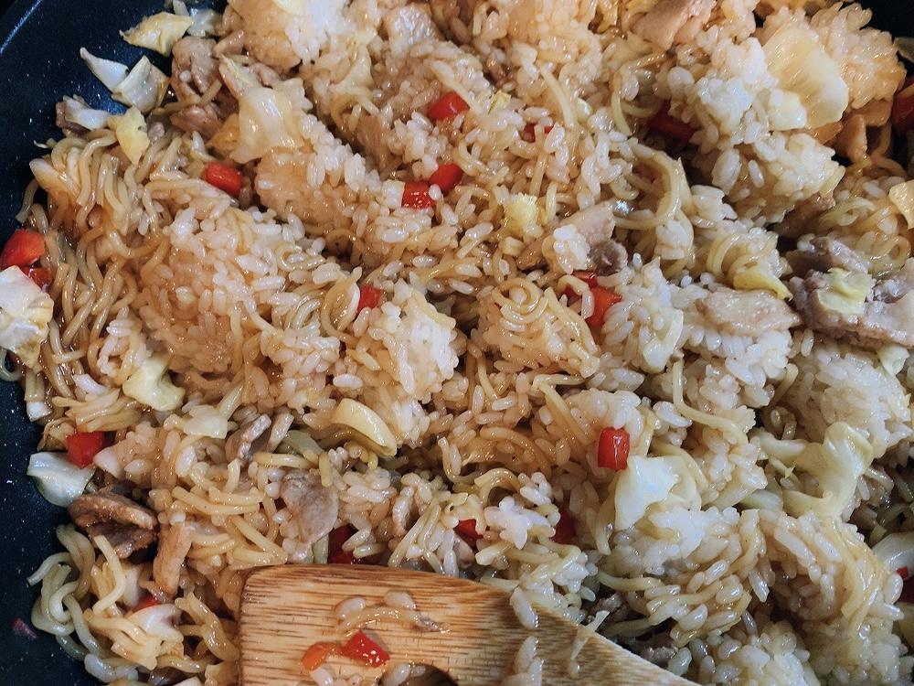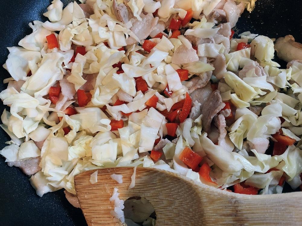 フライパンで、豚バラ肉、パプリカ、キャベツを炒める。そのあとで、焼きそば麺とごはんを加えて炒めていく。