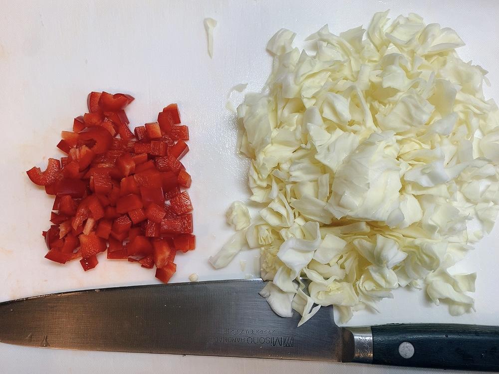 豚バラ肉は小さめの一口大に切る。パプリカは種を除き粗みじん切りにして、キャベツはざく切りにする。焼きそば麺は1cm幅程度に切っておく。