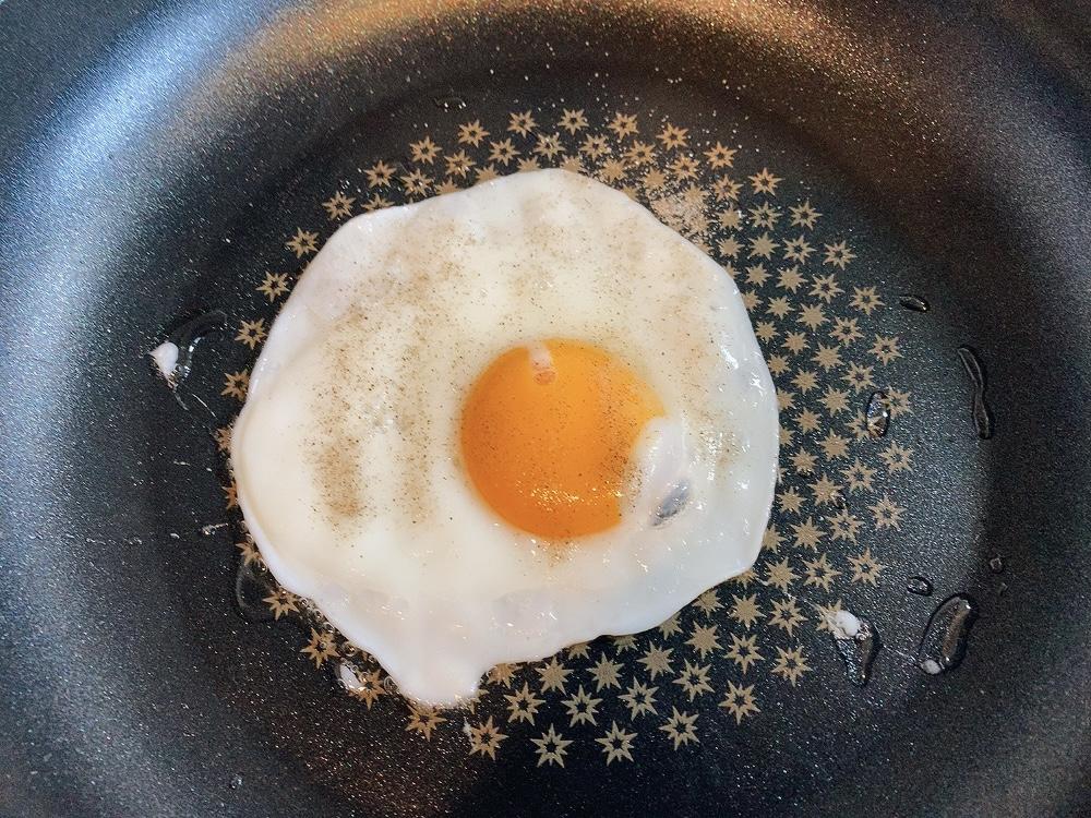 卵を割り塩コショウをふりかけて、目玉焼きを焼く。