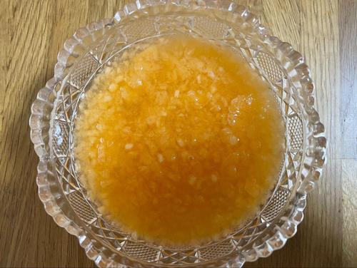 ゼラチンを少量の水でふやかしておく。ボウルにふやかしたゼラチンとSTEP1.のメロンペーストを少量入れ、湯煎にかけてゼラチンを溶かす。溶けたらSTEP1.のボウルに戻して全体に混ざるよう、よく混ぜる。タッパーに入れ冷蔵庫で5時間冷やし固める。固まったら塊がなくなるようスプーンで混ぜておく。