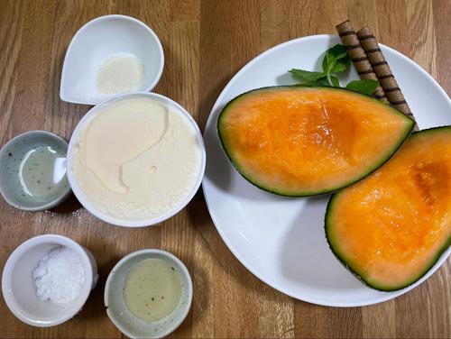 器にバニラアイスを適量盛り、メロンジュレ、一口大に切ったメロンを盛り付ける。飾りのミントとチョコクッキーを乗せれば完成だ。