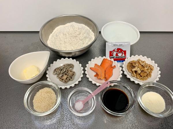 ホームベーカリーのレシピ通りに水、強力粉などの材料を順番に加え、食パンモードで焼く。具入れブザーが鳴ったら、干し野菜とくるみを加える。