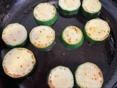別のフライパンに油を少量ひきズッキーニを焼く。片面に焼き色がついたらひっくり返して、フライパンに蓋をして蒸し焼きにする。ズッキーニに火が通ったらチリソースに絡ませ、ラー油をたらす。皿に盛り付ければ完成だ。ライムを搾っていただこう。