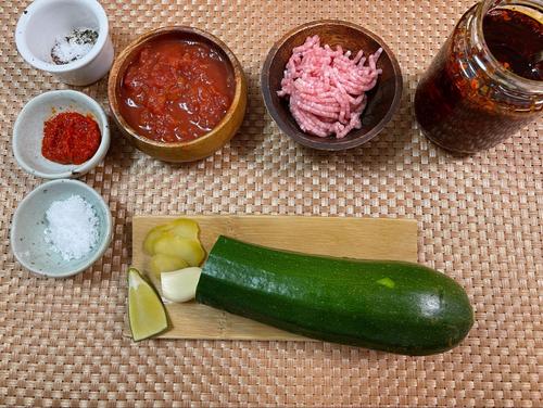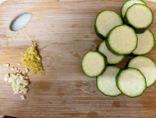 にんにく、生姜はみじん切りにする。ズッキーニはステーキサイズになるよう1.5cmの幅に切り、片面に隠し包丁を入れる。火が入りやすくなり、ソースがよく絡むようになる。隠し包丁はズッキーニの厚さの1/3ほどで入れればよい。
