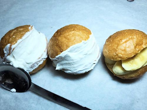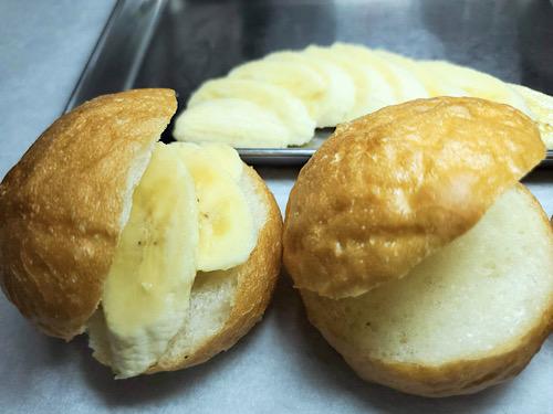 バナナの皮をむき、スライスカットして、横に切りひらいたパンに数枚はさむ。