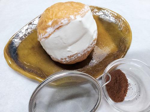クリームがパンについてしまっても、仕上げにココアパウダーを振るので大丈夫。茶こしを使って少しずつ振りかけよう。