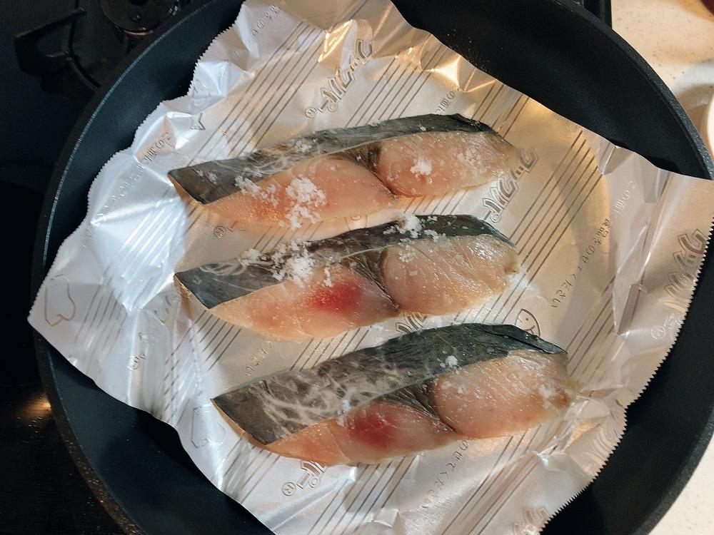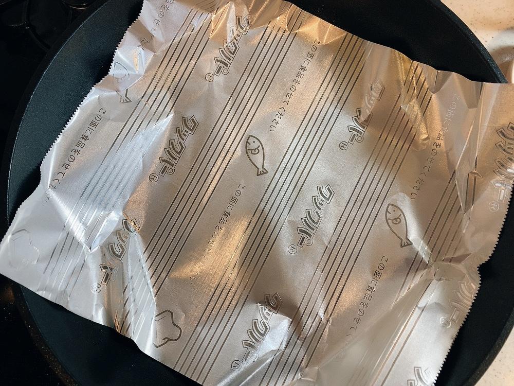 フライパン用アルミホイルの上にさわらを並べて、フタをして焼いていく。フタをすることでパサつきを防止して、ふっくらと仕上げることができる。