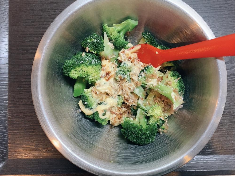 ブロッコリーが冷めたら、マヨネーズ、醤油、かつお節と和えて完成となる。