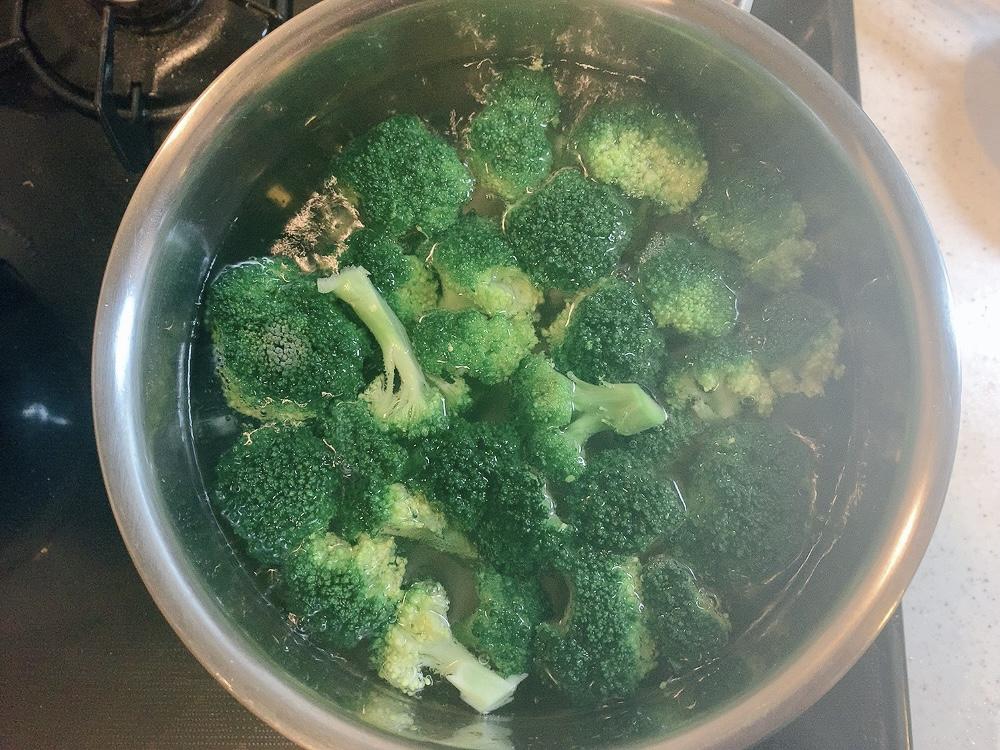 鍋に多めに湯を沸かして、カットしたブロッコリーを1分程度茹でる。ザルにあげたら、そのままにしておき余熱で火を通す。