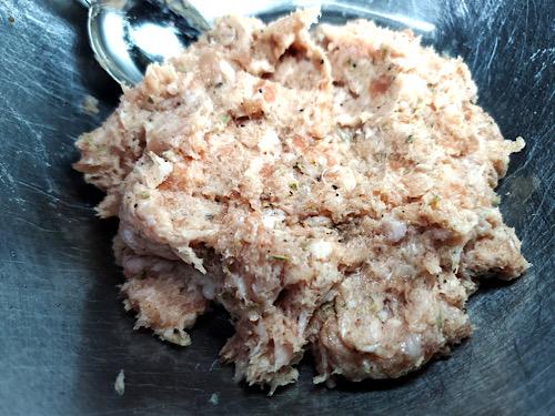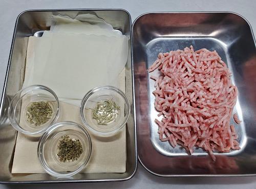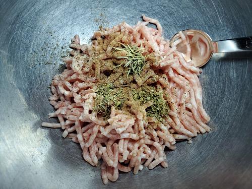 ボウルにひき肉とハーブ、塩コショウ、ナツメグを入れる。粘り気が出てまとまるまで混ぜる。