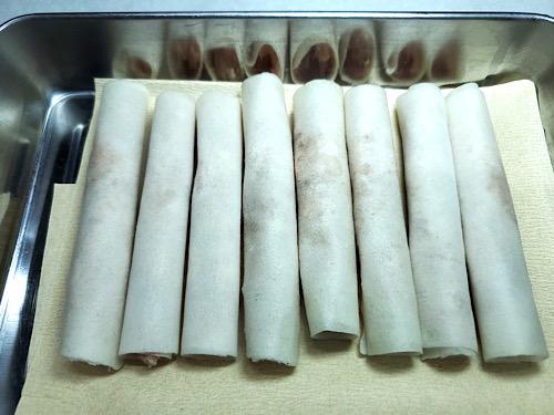 ボウルの中で8等分にし、春巻きの皮にのせて細長く巻いていく。このとき、端は折り返さず、開けたままでのり巻きのように巻いていく。